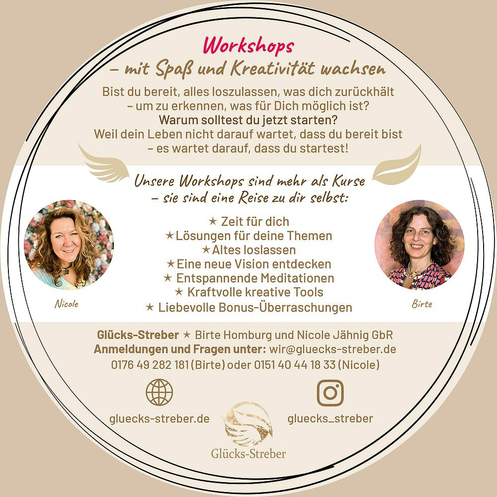 Diese Tages-Retreats leite ich gemeinsam mit Nicole und zusammen nennen wir uns Glücks-Streber. Wir verbinden Kreativität und Coaching, sodass Du im geschützten Raum mit Spaß wachsen kannst. Du musst nicht denken, dass Du dafür kreativ sein musst, Du darfst nur Lust und Laune mitbringen Deine nächsten Schritte zu gehen und wir begleiten Dich. Wir wünschen uns, dass Du Wnadel erlebst und nicht nur denkst.